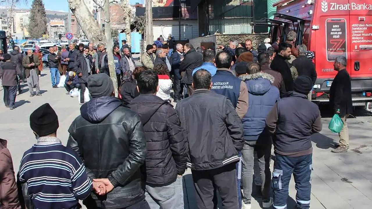Adıyaman'da sabahın erken saatlerinde kurulan Ziraat Mobil Şubesi önüne yardım parası almak için gelen çok sayıda afetzede, uzun kuyruklar oluşturdu.