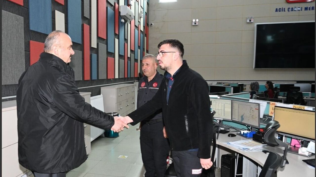 Vali Canalp, programı kapsamında 112 Acil Çağrı Merkezi’ni de ziyaret etti. Burada görevli personelle bayramlaşan Canalp, çalışanlara görevlerinde kolaylıklar diledi.