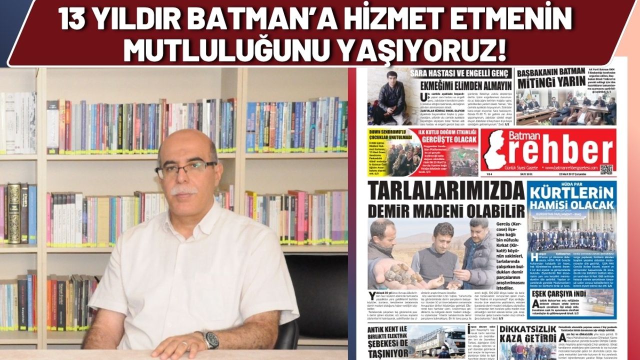 Gazetemiz Batman Rehber’i halkımızla buluşturmanın üzerinden 13 yıl geçti. Tam 13 yıldır Batman halkına hizmet etmenin, halkımızın sesi olmanın mutluluğunu yaşıyoruz. Heyecanımız, coşkumuz ilk günkü gibi… İdeallerimizden, hizmet aşkımızdan taviz vermedik. İl gün neysek şimdi de oyuz!