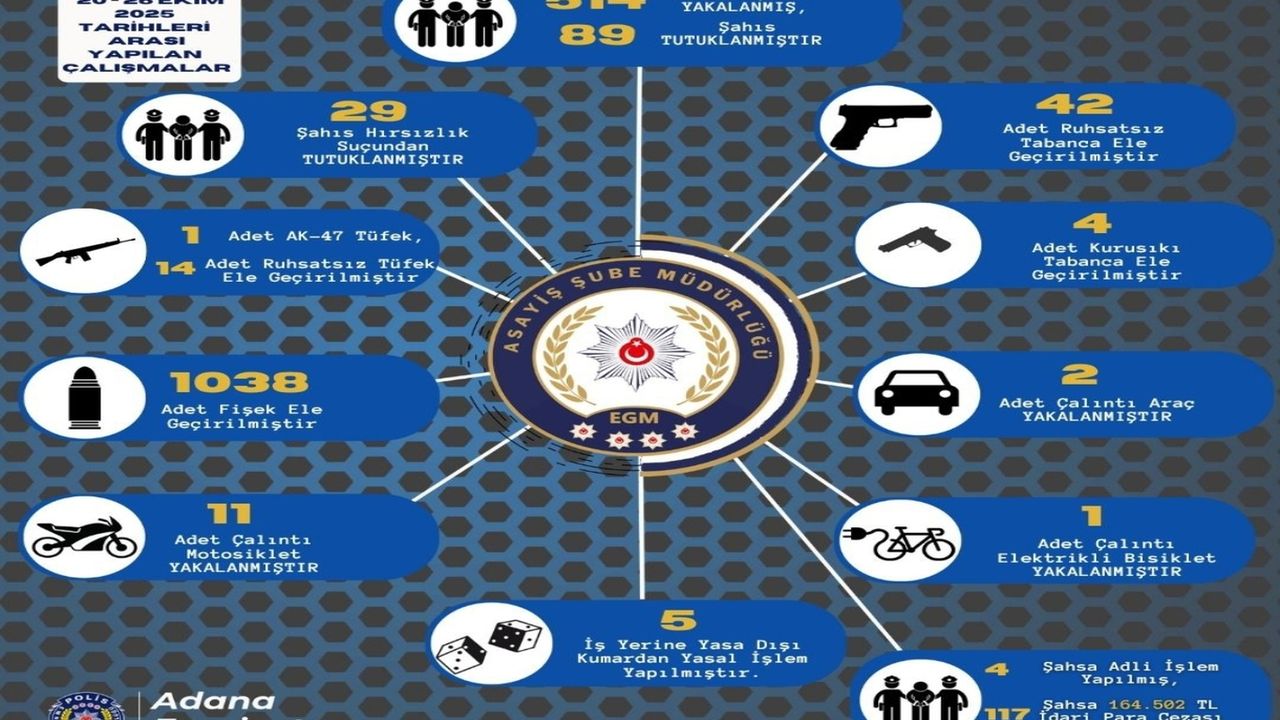 Adana Emniyet Müdürlüğü Asayiş Şube Müdürlüğü, 20-26 Ekim 2025 tarihleri arasında kent genelinde suç ve suçlulara yönelik gerçekleştirdiği denetim ve operasyonların sonuçlarını paylaştı.