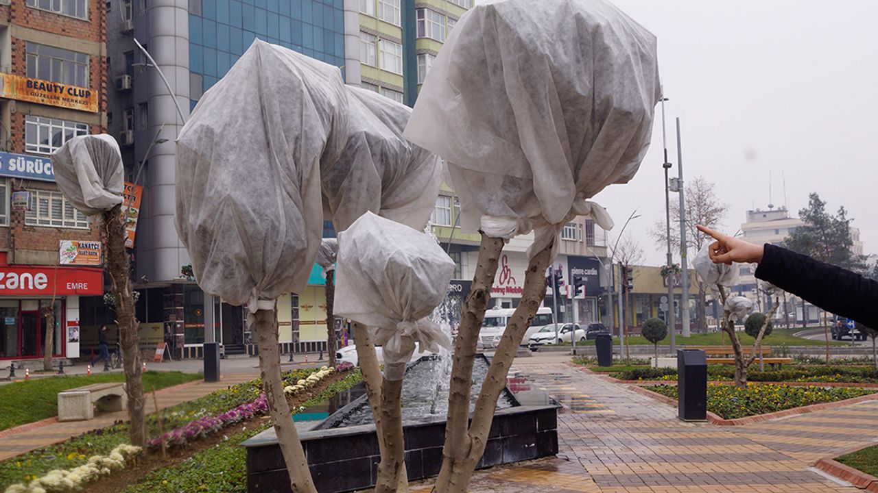 naylon geçiren belediye ağaçları don olaylarına karşı korumaya aldı.