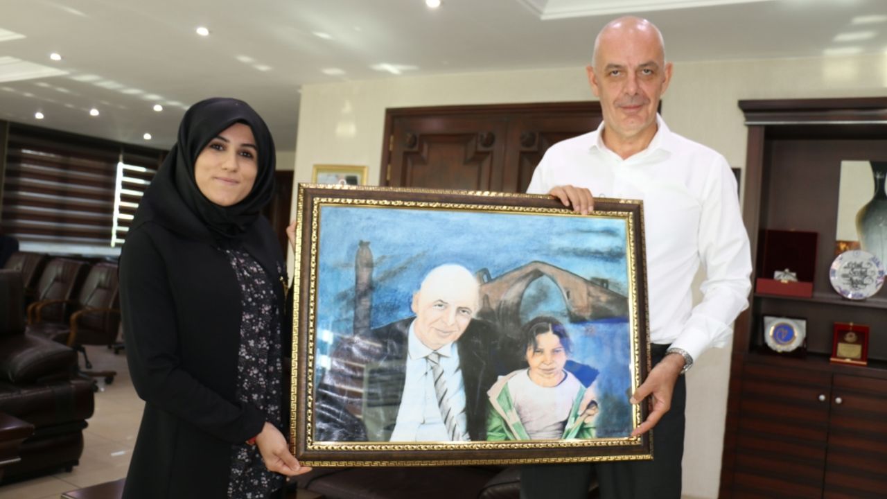 Toz Pastel, kuru boya karışımı ile yaptığı Başkan Vekili Aksoy'un bir kız ile yan yana olduğu resmi tuvale yansıttı.
