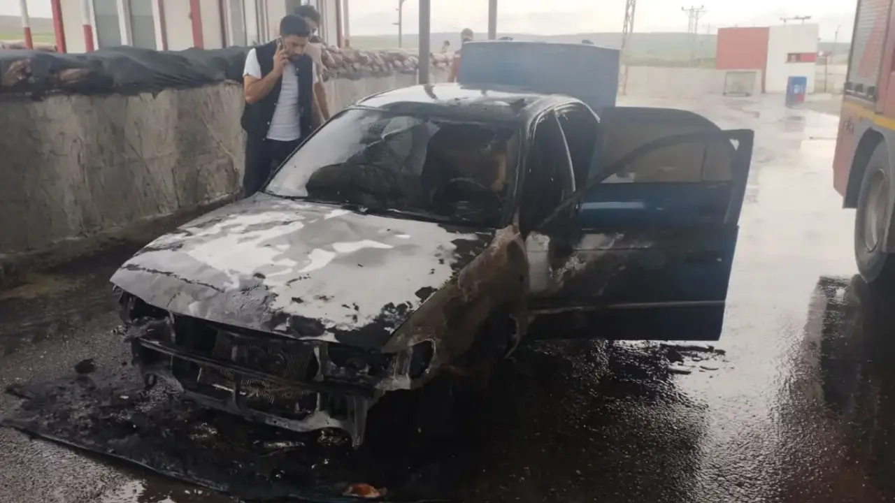 Baba ve çocuğu yanan araçtan çıkarılırken, itfaiye ekipleri