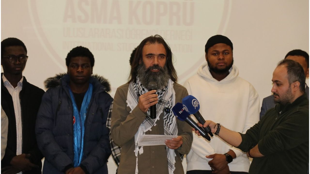 "Ümmete Barış Kudüs'e Özgürlük" temasıyla hazırlanan basın açıklamasını Asma Köprü Uluslararası Öğrenci Derneği Yönetim Kurulundan Zeynel Abidin Özkan, okudu.