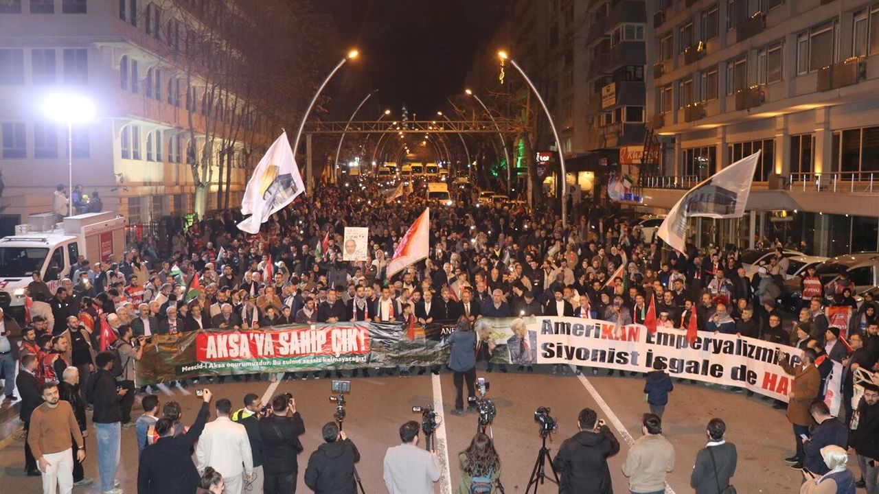 Yürüyüş boyunca katılımcılar, 'Ankara'dan Kudüs'e, Filistin'e bin selam', 'Mescid-i Aksa onurumuzdur', 'Katil israil, katil ABD', 'Aksa Tufanı siyonizmi yenecek', 'Siyonist katiller hesap verecek', 'Oluk oluk kan aksa, kurtulacak El Aksa' ve 'Mescid-i Aksa, müminleri bekliyor' sloganları atarak Filistin'e desteklerini dile getirdi.