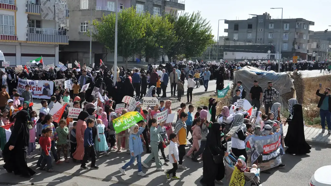 HÜDA PAR Batman Kadın Kolları İl Başkanlığı öncülüğünde bir araya gelen binlerce anne, çocuklarıyla birlikte siyonist işgal rejiminin Gazze'deki bebek, çocuk ve kadın katliamlarını düzenlediği kitlesel yürüyüşle protesto etti.