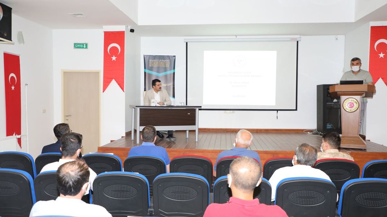 Konferans salonunda gerçekleşen toplantıda, ilçede koronavirüs ile mücadele