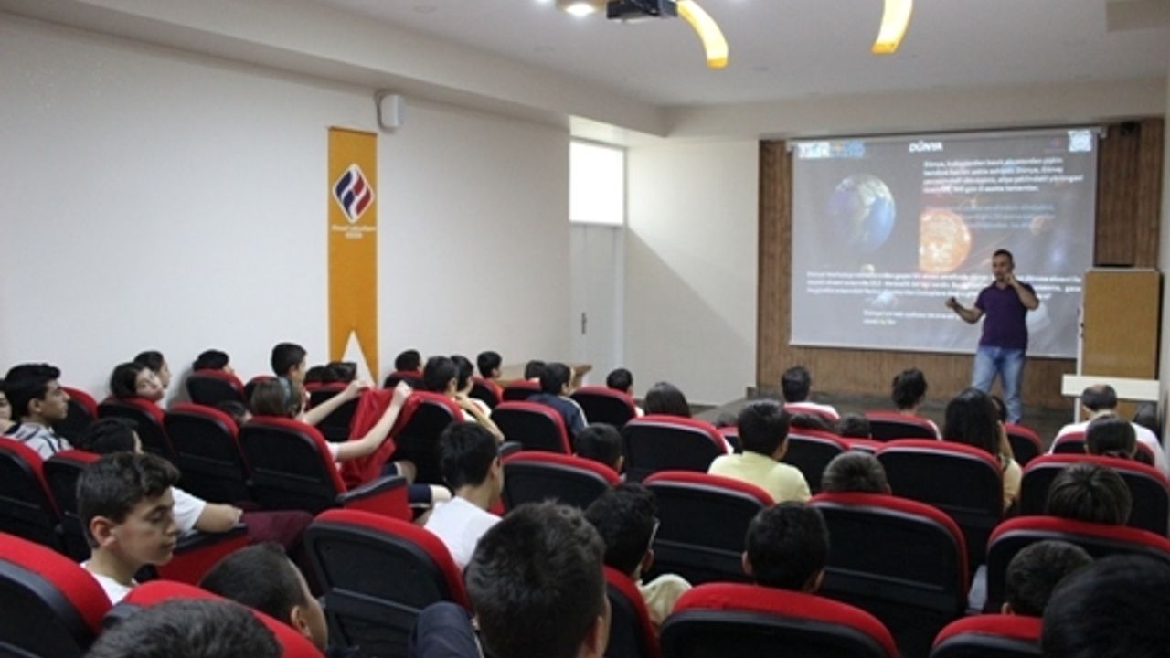 Batman Final Koleji Müdürü Orhan ALP'in daveti üzerin Mezopotamya Astronomi Derneği (MAD) Yönetim Kurulu Başkanı Astronom Mahmut TEKEŞ Batman Final Koleji Seminer salonunda önceki gün saat, 14:00-16:00 arasında 120 'ye yakın orta okul öğrencisine 'Evrendeki Konumumuz ve Güneş Sistemi' üzerine seminer verdi.