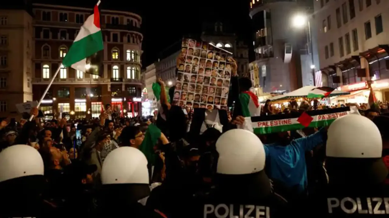 Avusturya'nın başkenti Viyana'nın önemli caddelerinden Mariahilfer caddesinde bir araya gelen protestocular, Filistin bayraklarının yanı sıra "Acil ateşkes", "Soykırıma hayır" ve "Özgür Filistin" yazılı pankartlar taşıdı.