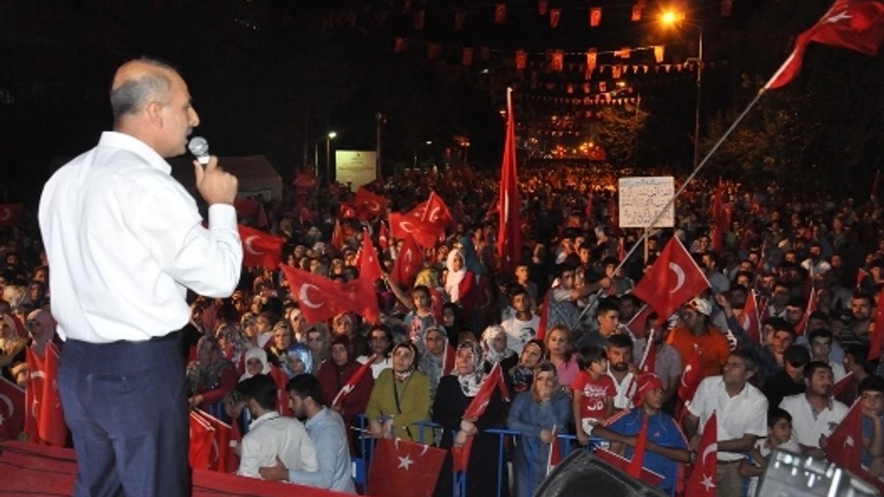 Ardından alana gelen Vali Ahmet Deniz, ilk günden bu yana alanı terk etmeyen halka teşekkürlerini iletti. Vali Deniz, 'Belki bu meydanlarda son günümüz olacak. Ama bu meydanlarda olmazsak bile yüreğimizle inşallah Batman'ın her yerinde, Türkiye'nin her yerinde olacağız. Çünkü bu Fethullahçı terör örgütünün gayesi ve amacını hepimiz çok iyi biliyoruz. Onlar zannettiler ki, bu darbe girişiminin karşısında bu millet susacak. Bu millet sussa, bu toprak susmaz, toprak sussa, toprağın altında yatan şüheda susmaz. Şehitlerimizin susmadığı bir yerde bu millet susar mı? Bu millet susmadı, susmayacak.' diye konuştu.