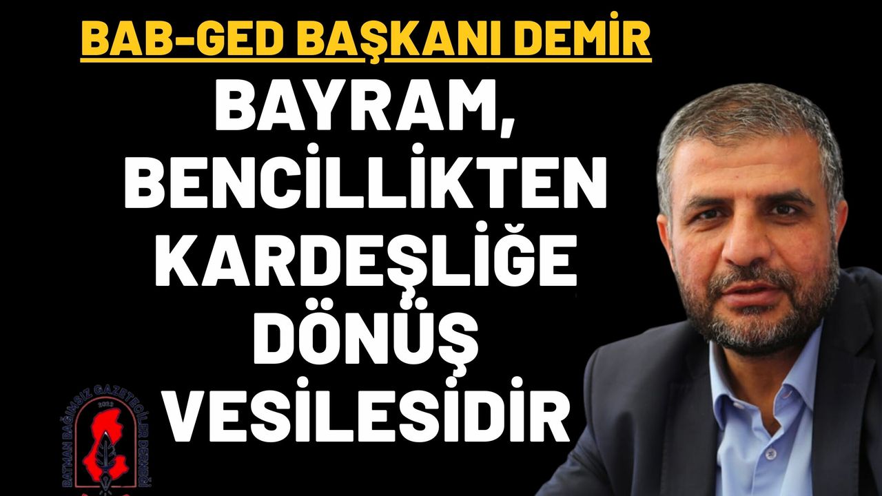 Batman Bağımsız Gazeteciler Derneği (BAB-GED) Başkanı Veysi Demir, Ramazan Bayramı dolayısıyla yayımladığı mesajda, İslam coğrafyasında yaşanan çatışmalar ve gazetecilere yönelik saldırılar nedeniyle bayrama "mahzun" girildiğini ifade etti. Demir, bayramın mazlumların kurtuluşuna ve ümmetin vahdetine vesile olmasını diledi.