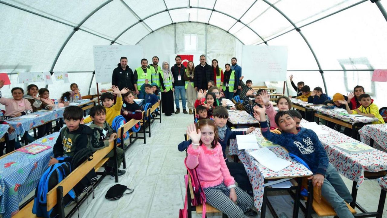 Eğitim çadırında, gönüllü öğretmenlerin