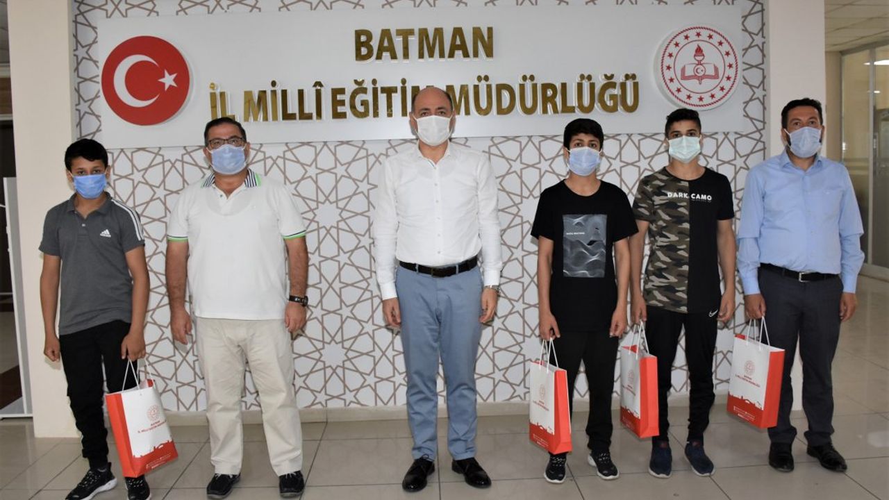 ziyarete gelen başarılı sporcuları makamında konuk eden İl Milli Eğitim Müdürü
