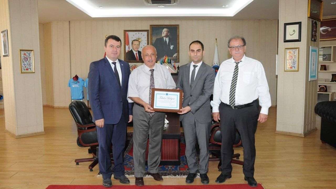 Cemil Avim’e takdir belgesi ve üniversitenin plaketini takdim etti.