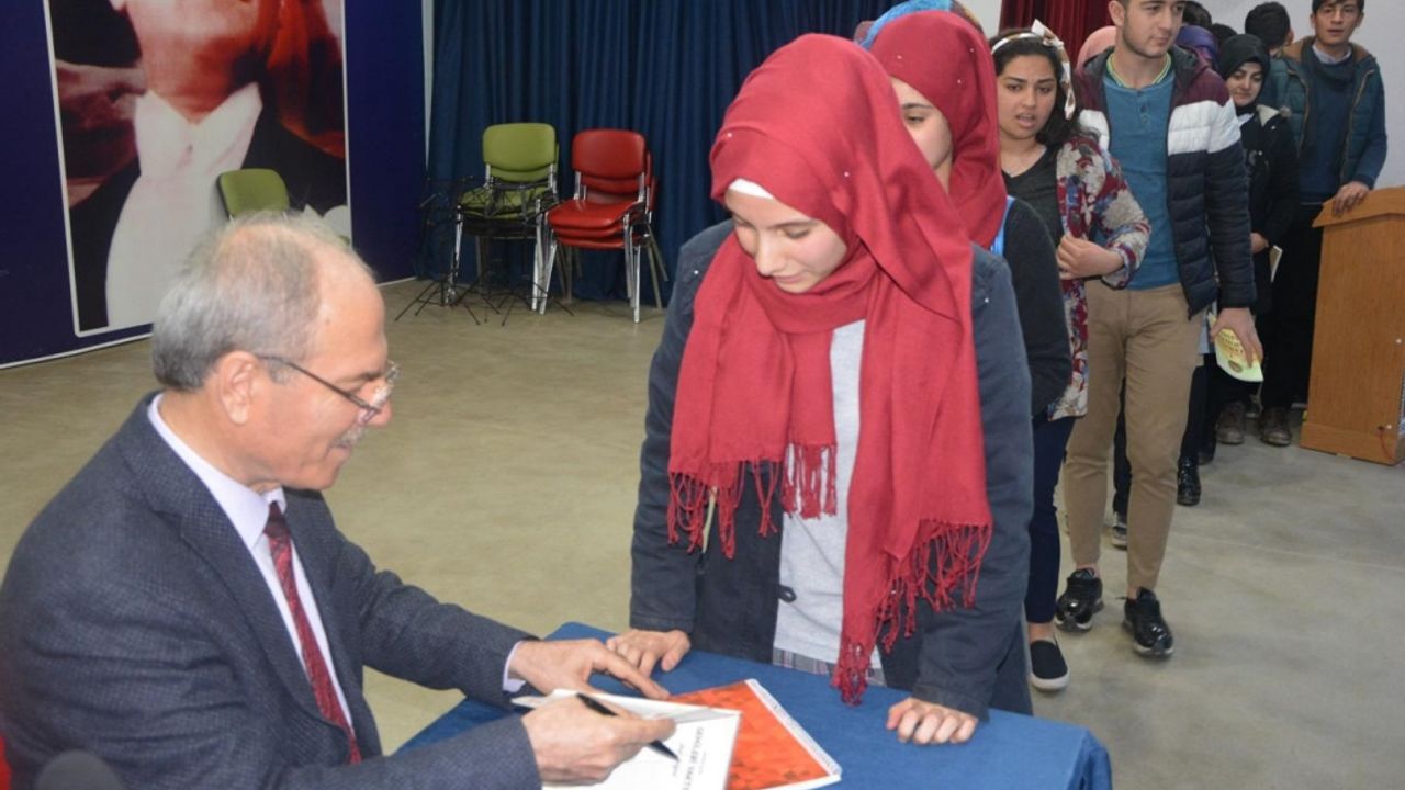 Ertuğrul yaptığı konuşmanın ardından öğrencilere hediye edilen kitaplara imza attı.