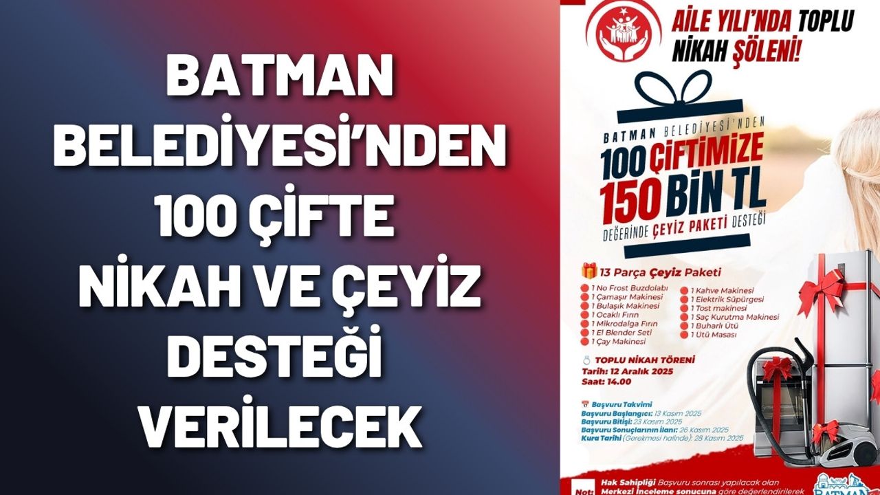 Batman Belediyesi Sosyal Yardım İşleri Müdürlüğü, “Aile Yılı” kapsamında anlamlı bir sosyal projeye imza atıyor. Maddi imkânsızlıklar nedeniyle evlenemeyen genç çiftler için başlatılan “Toplu Nikâh ve Çeyiz Desteği Projesi” kapsamında, 100 çifte hem düğün organizasyonu hem de 150 bin TL değerinde çeyiz paketi desteği sağlanacak.