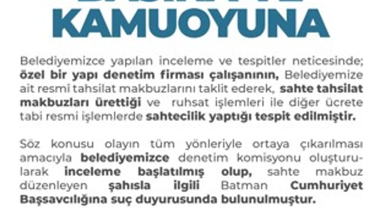 Açıklamada, olayın tüm yönleriyle ortaya çıkarılması amacıyla belediye bünyesinde denetim komisyonu oluşturularak inceleme başlatıldığı ifade edildi. Sahte makbuz düzenlediği tespit edilen şahıs hakkında ise Batman Cumhuriyet Başsavcılığına suç duyurusunda bulunulduğu bildirildi.