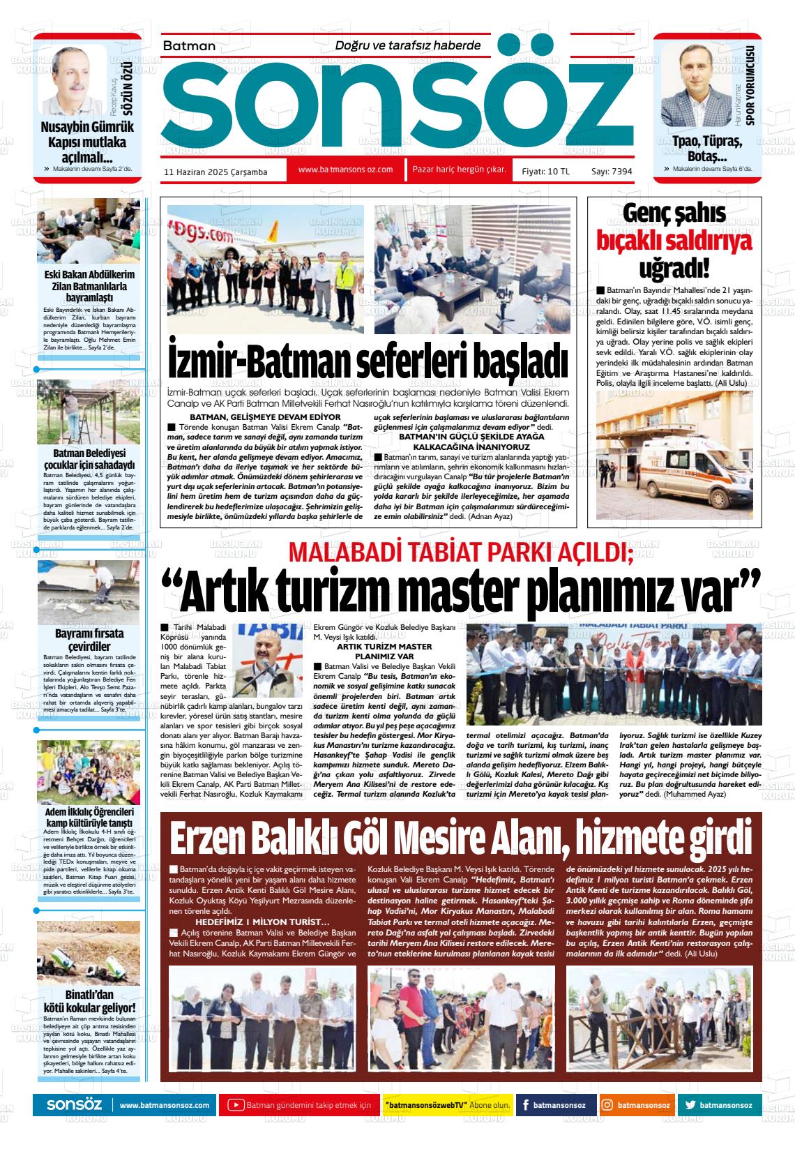 Batman Sonsöz Gazetesi’nin 11 Haziran tarihli manşeti