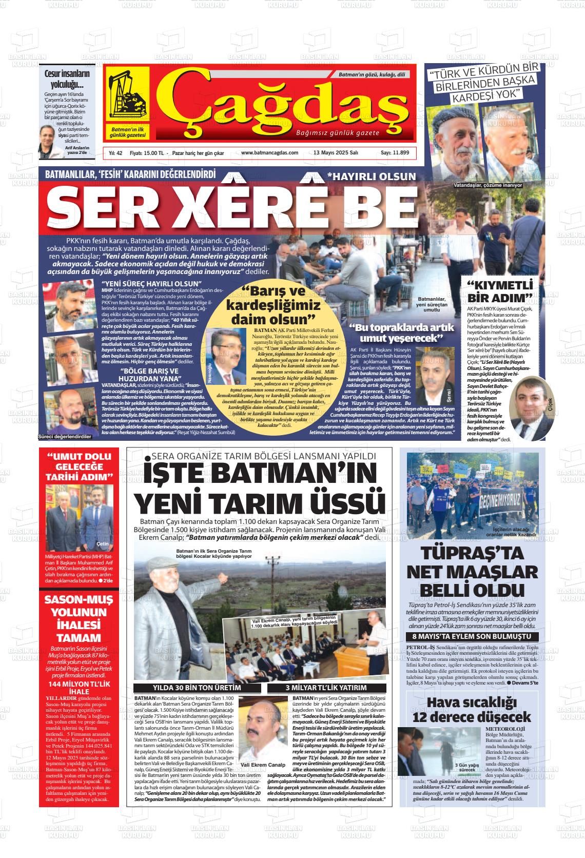 Batman Çağdaş Gazetesi’nin 13 Mayıs tarihli manşeti