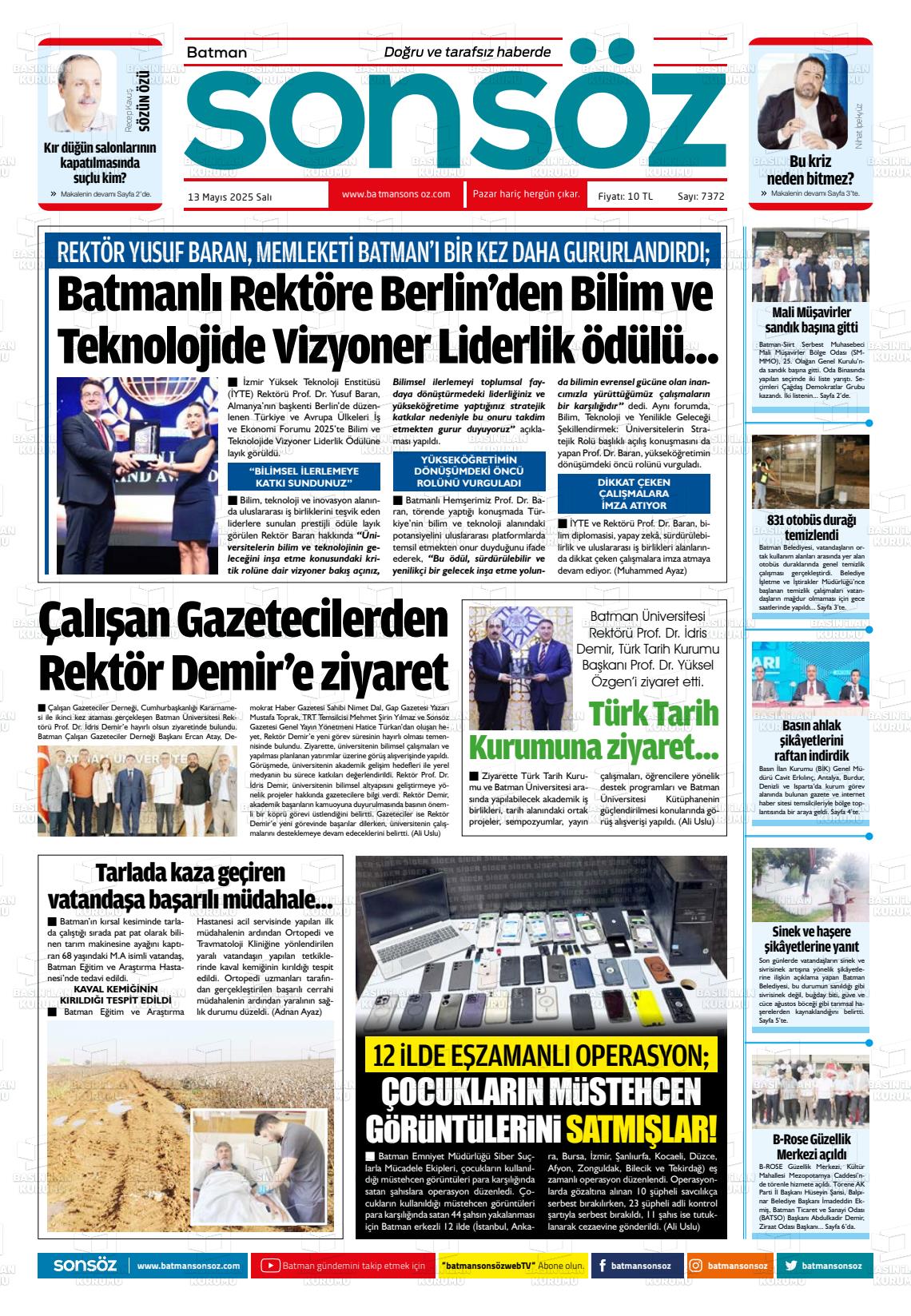 Batman Sonsöz Gazetesi’nin 13 Mayıs tarihli manşeti