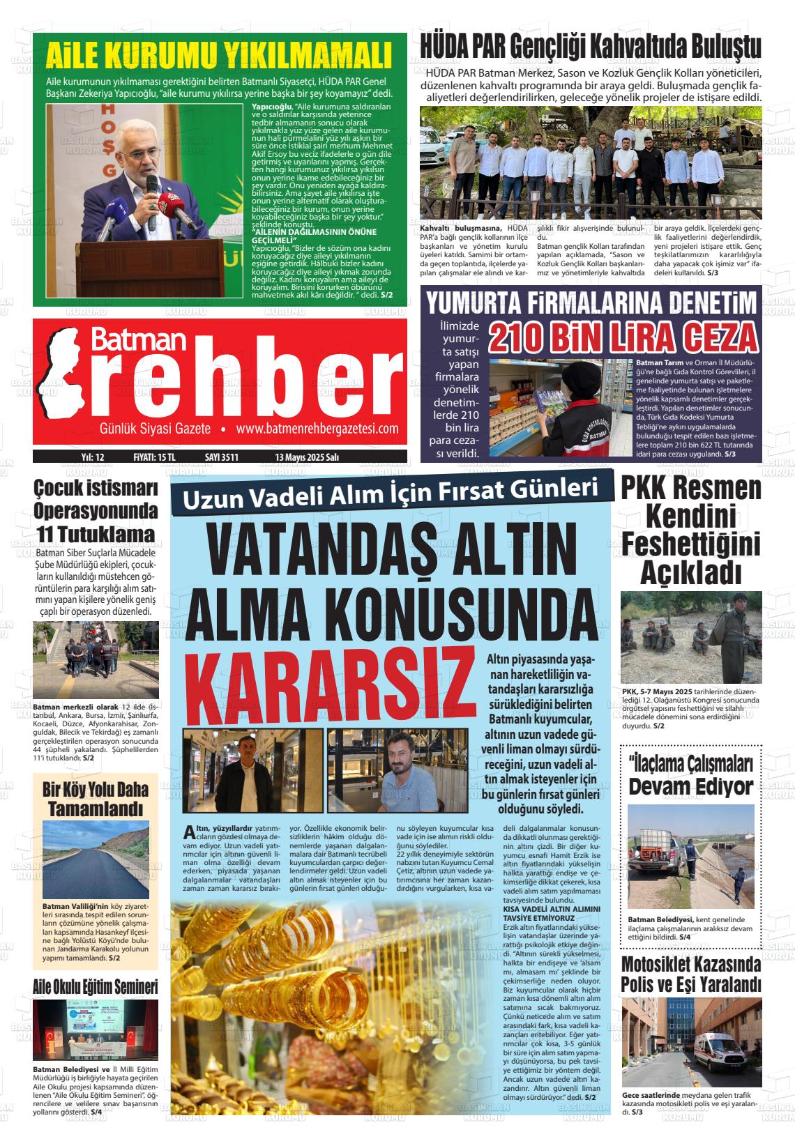 Gazetemiz Batman Rehber’in 13 Mayıs tarihli manşeti