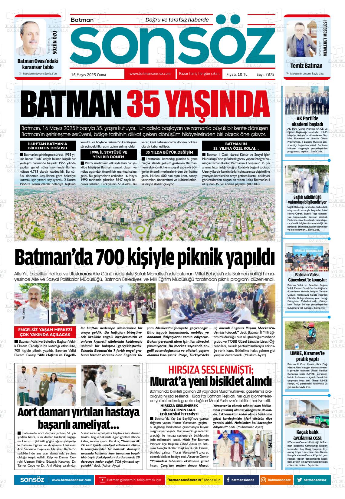 Batman Sonsöz Gazetesi’nin 16 Mayıs tarihli manşeti