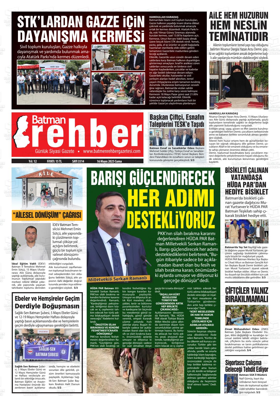Gazetemiz Batman Rehber’in 16 Mayıs tarihli manşeti