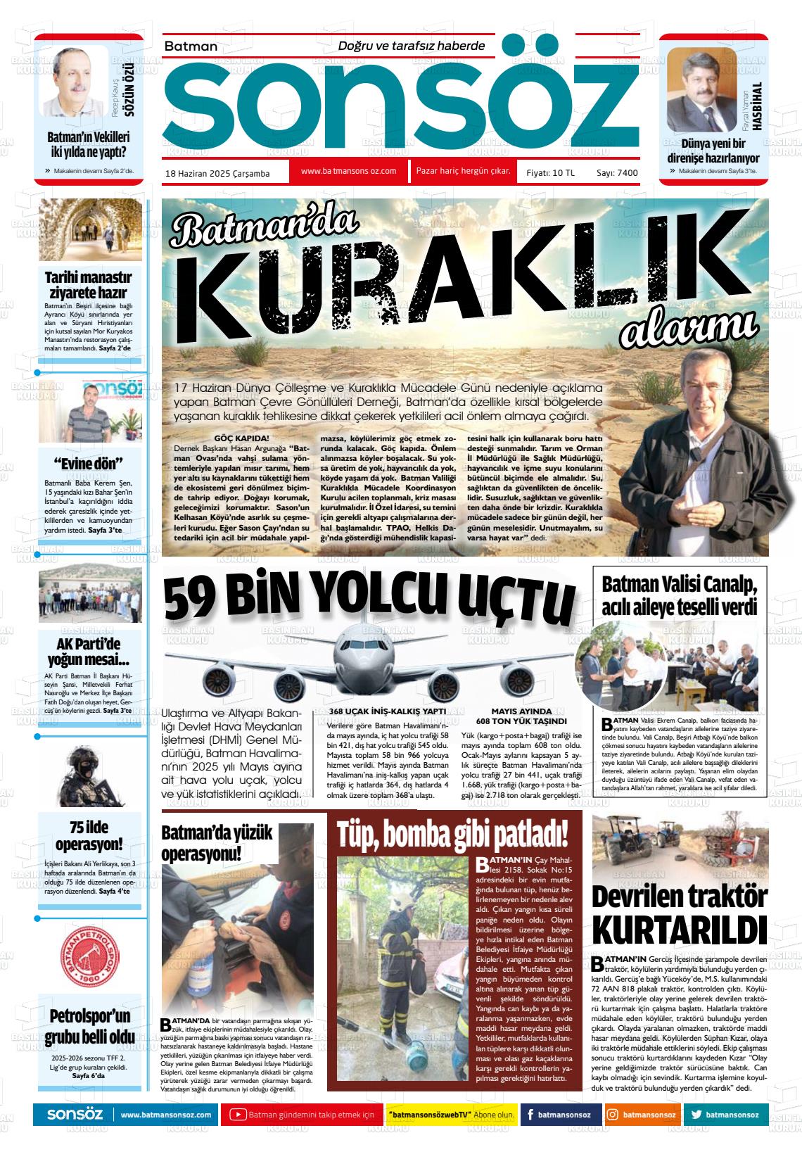 Batman Sonsöz Gazetesi’nin 18 Haziran tarihli manşeti