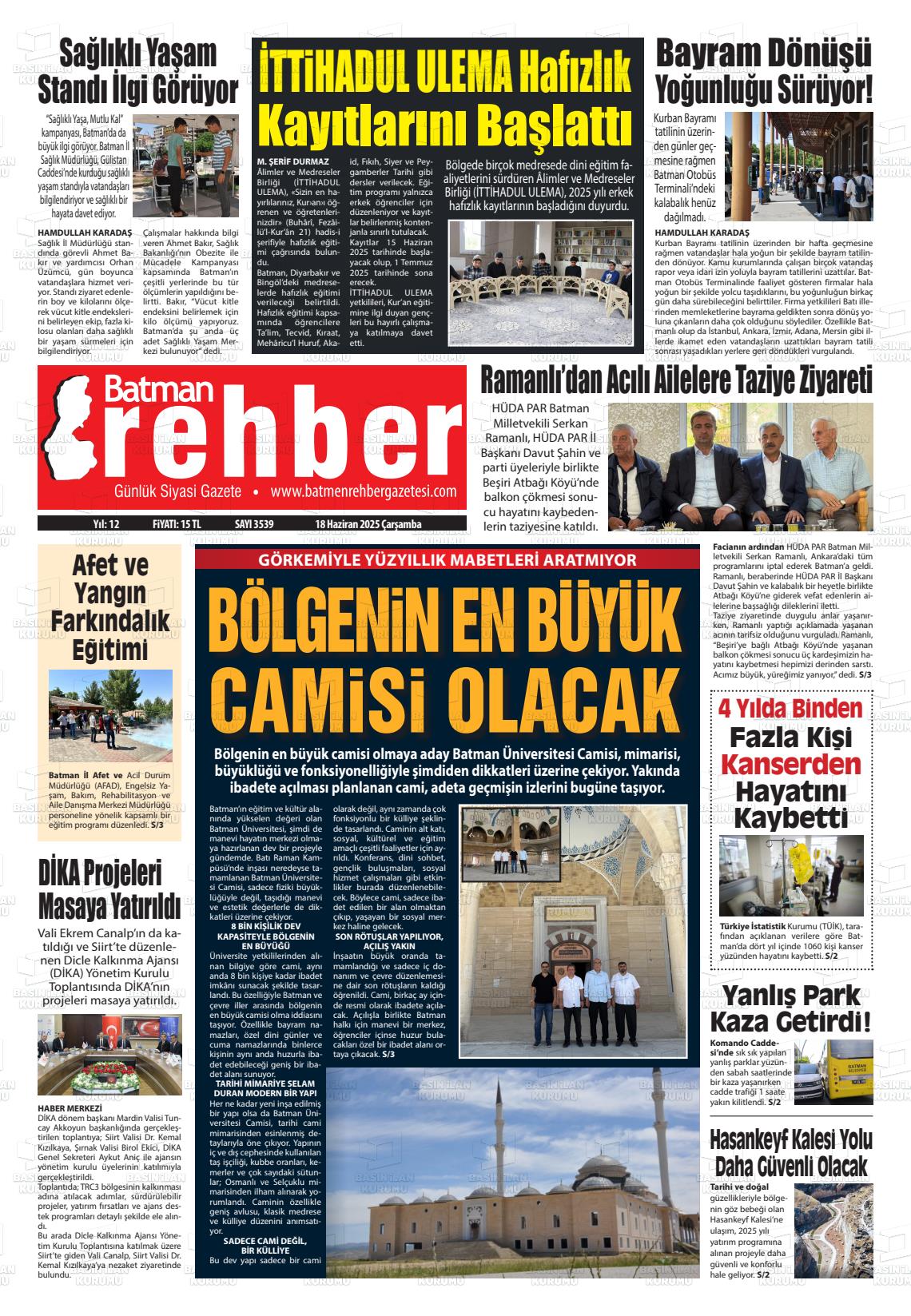 Gazetemiz Batman Rehber’in 18 Haziran tarihli manşeti