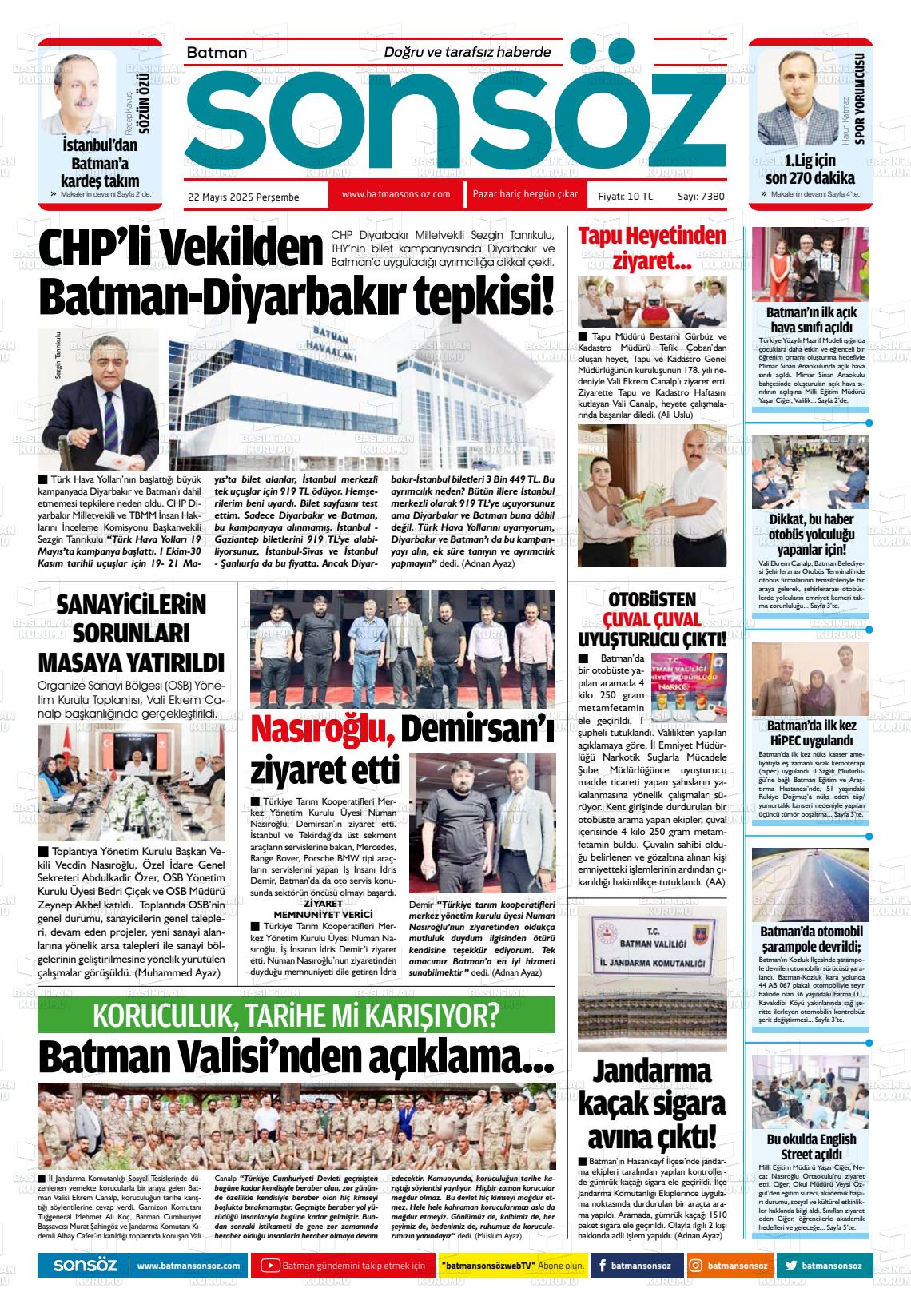 Batman Sonsöz Gazetesi’nin 22 Mayıs tarihli manşeti