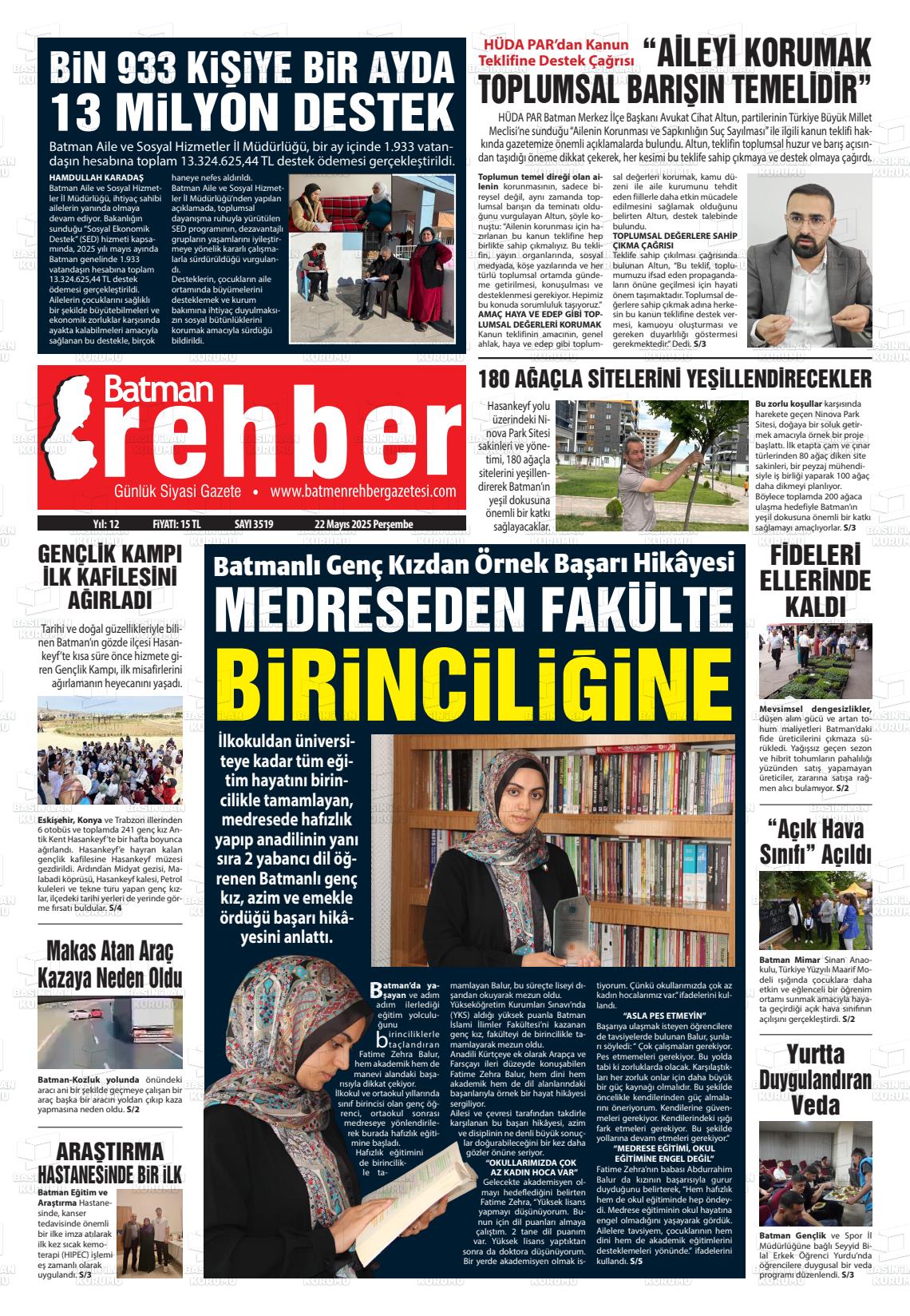 Gazetemiz Batman Rehber’in 22 Mayıs tarihli manşeti