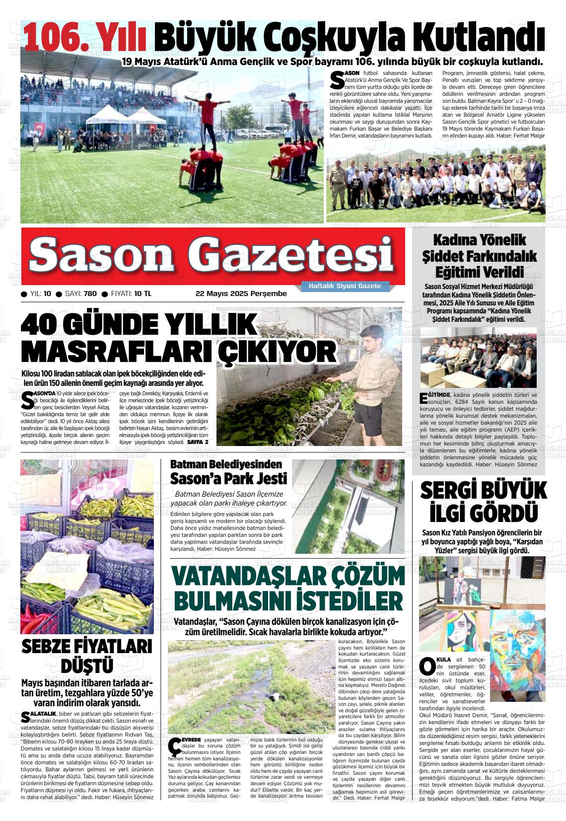 Sason Gazetesi’nin 22 Mayıs tarihli manşeti
