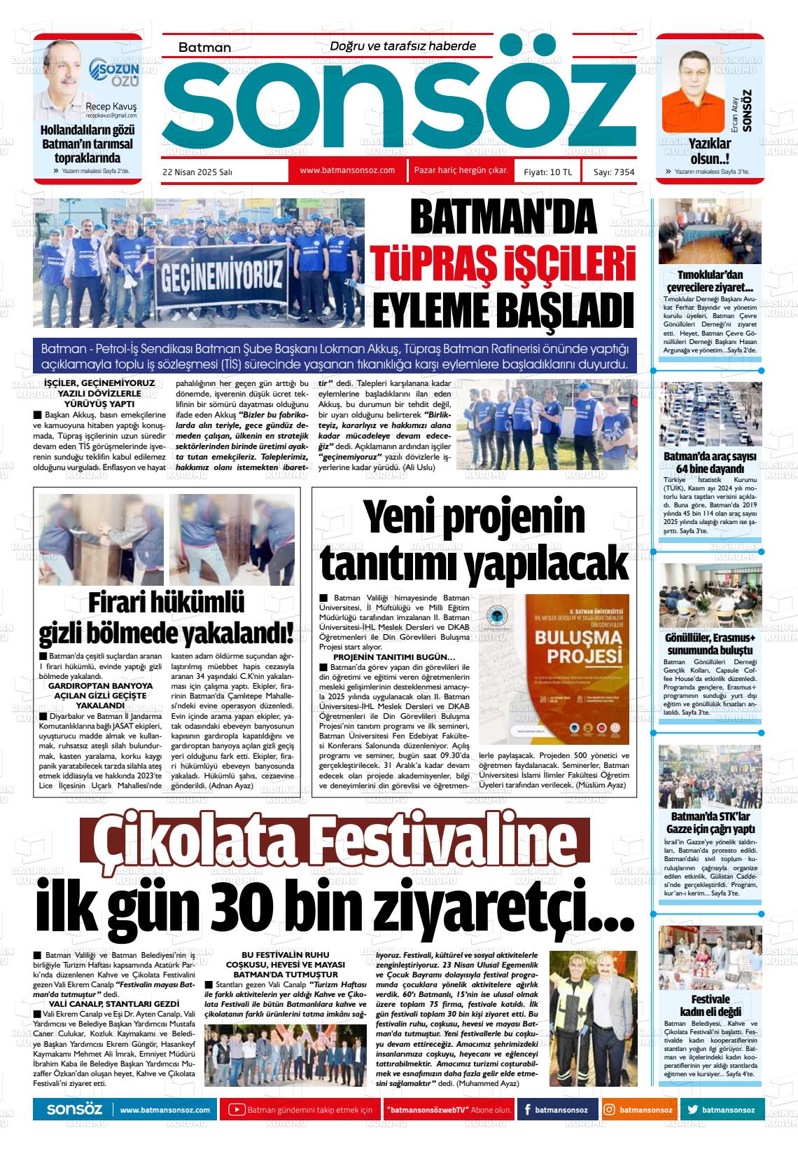 Batman Sonsöz Gazetesi’nin 22 Nisan tarihli manşeti