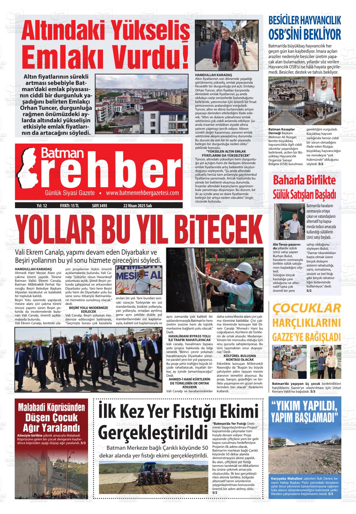 Gazetemiz Batman Rehber’in 22 Nisan tarihli manşeti