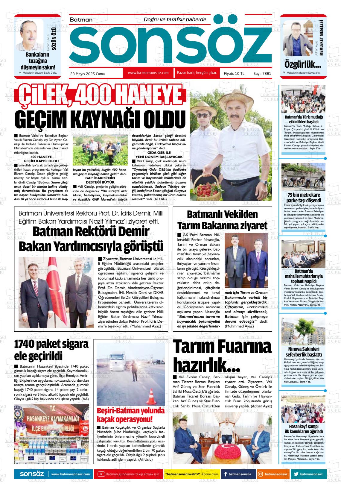 Batman Sonsöz Gazetesi’nin 23 Mayıs tarihli manşeti