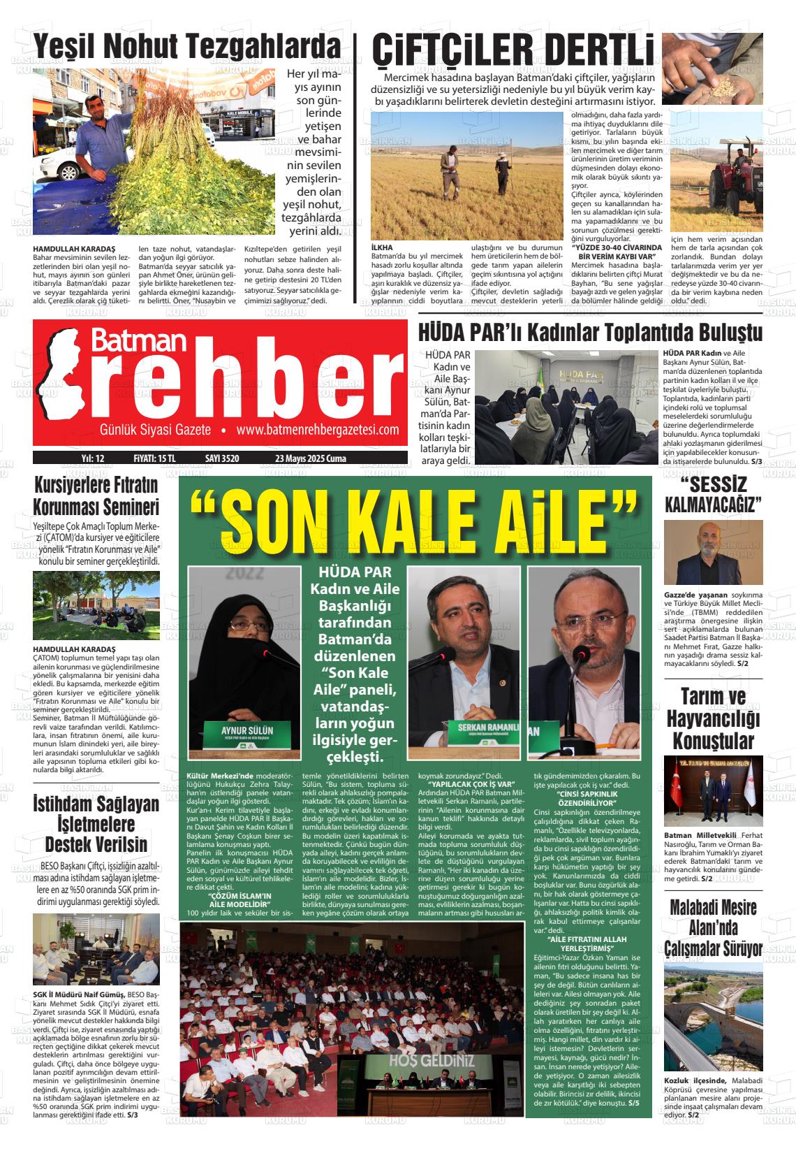 Gazetemiz Batman Rehber’in 23 Mayıs tarihli manşeti