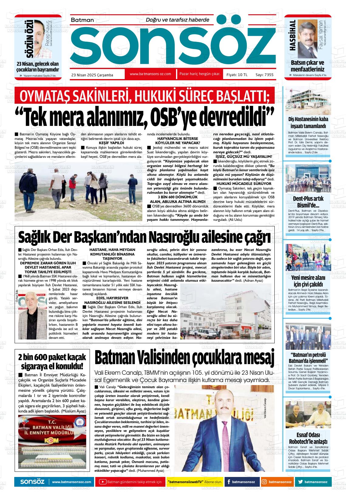 Batman Sonsöz Gazetesi’nin 23 Nisan tarihli manşeti