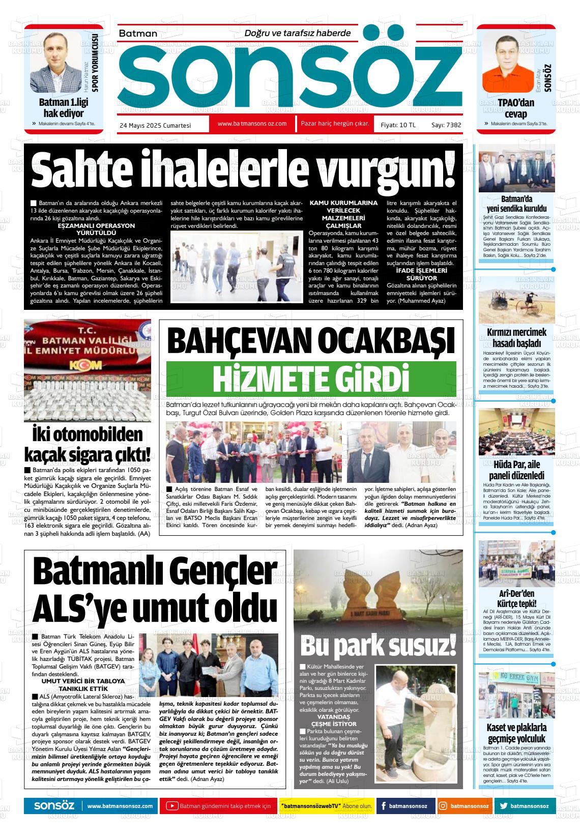 Batman Sonsöz Gazetesi’nin 24 Mayıs tarihli manşeti