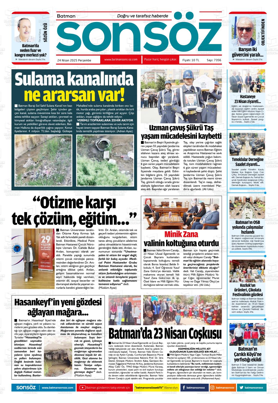 Batman Sonsöz Gazetesi’nin 24 Nisan tarihli manşeti