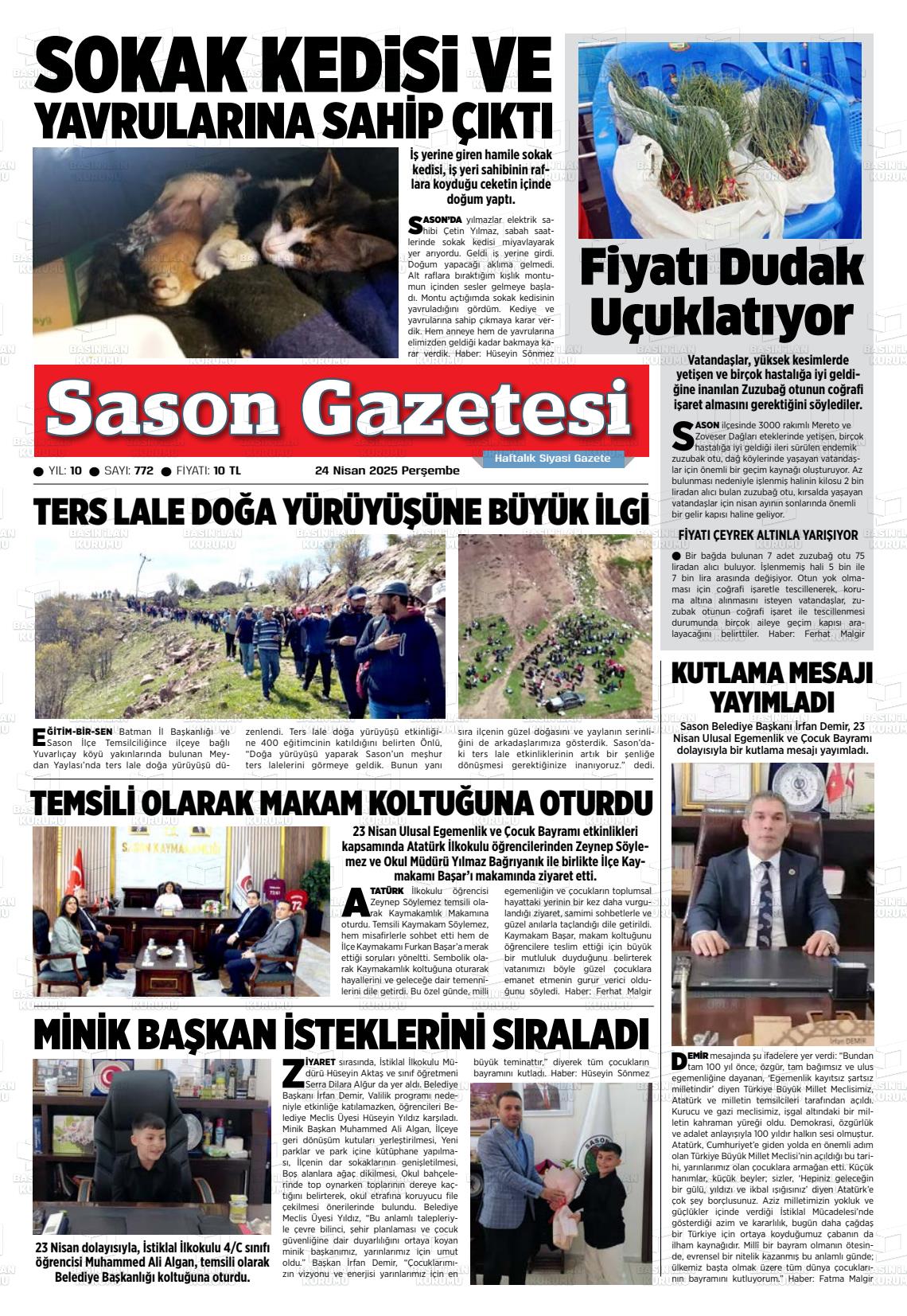 Sason Gazetesi’nin 24 Nisan tarihli manşeti