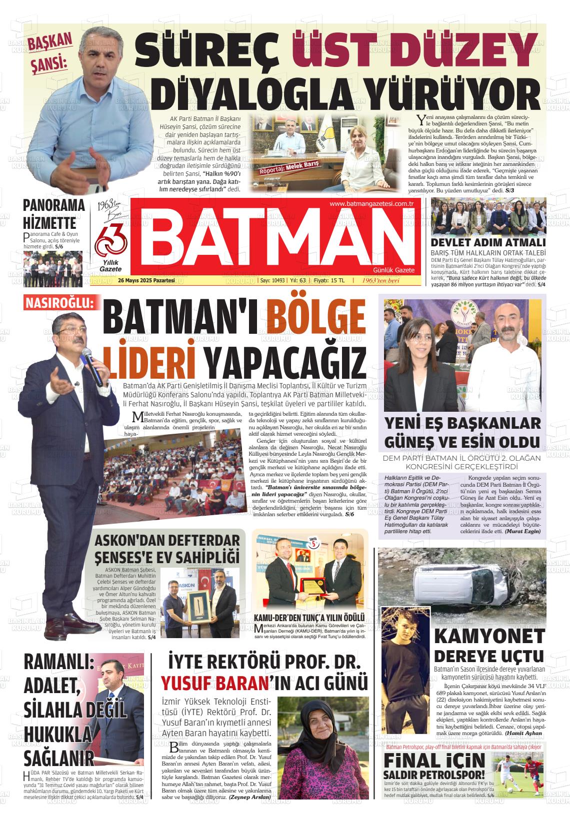 Batman Gazetesi’nin 26 Mayıs tarihli manşeti