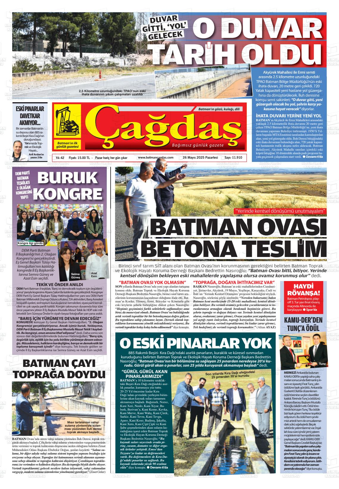 Batman Çağdaş Gazetesi’nin 26 Mayıs tarihli manşeti