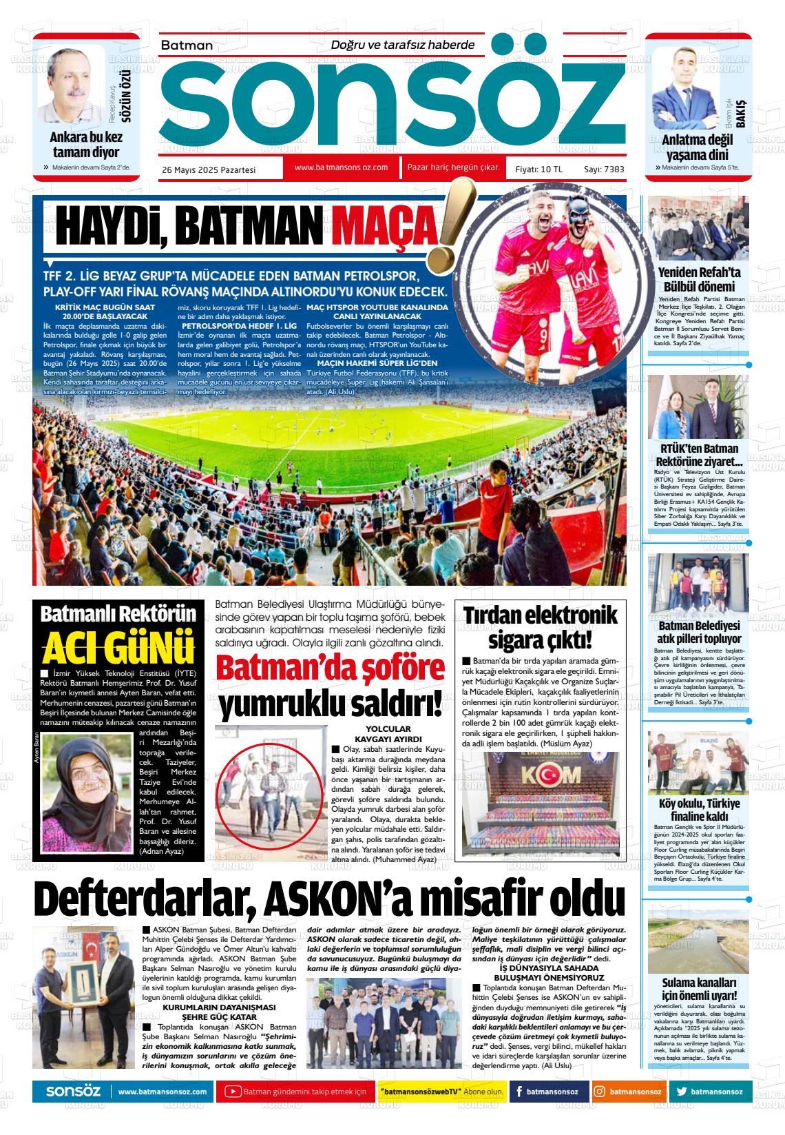 Batman Sonsöz Gazetesi’nin 26 Mayıs tarihli manşeti