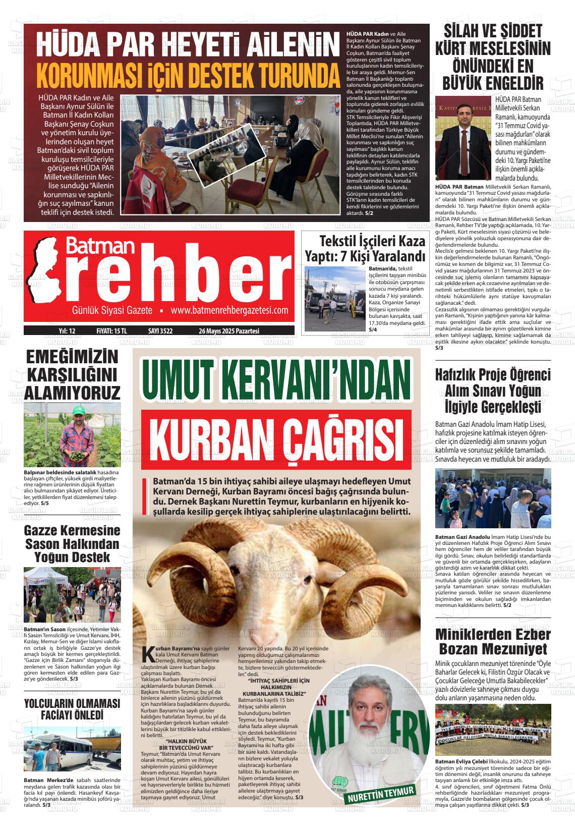 Gazetemiz Batman Rehber’in 26 Mayıs tarihli manşeti