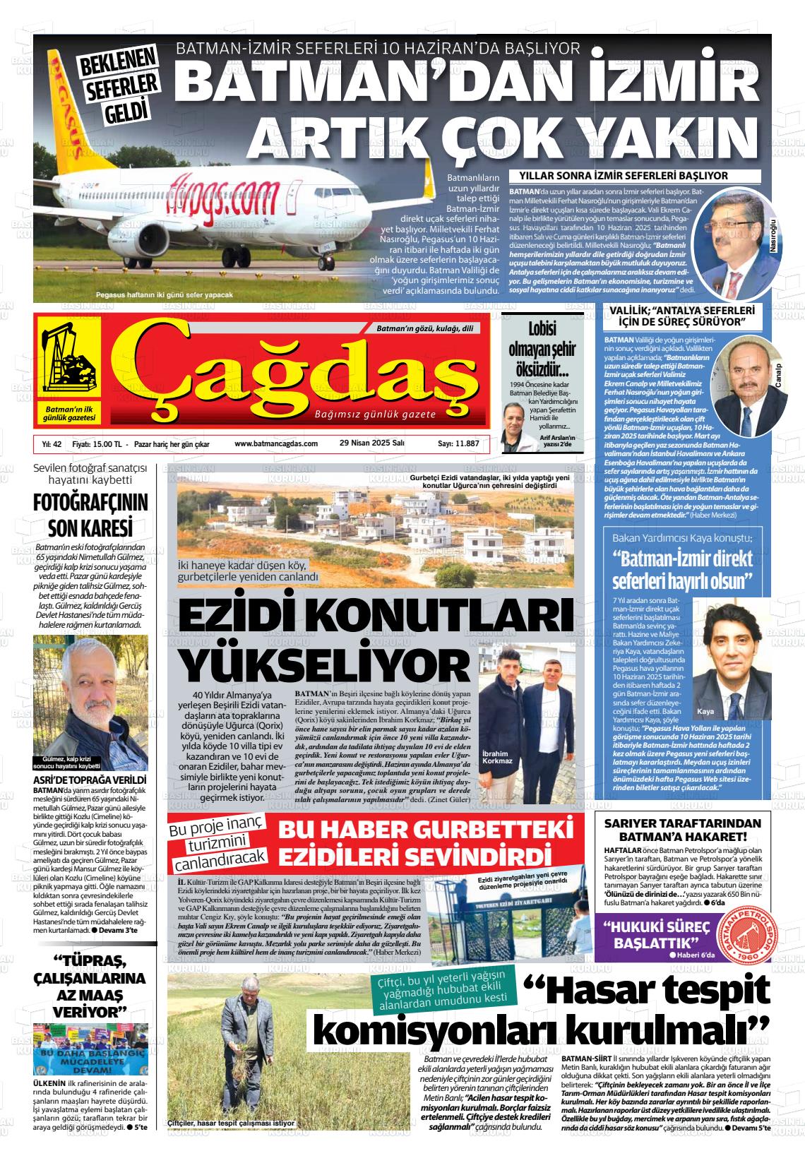 Batman Çağdaş Gazetesi’nin 29 Nisan tarihli manşeti