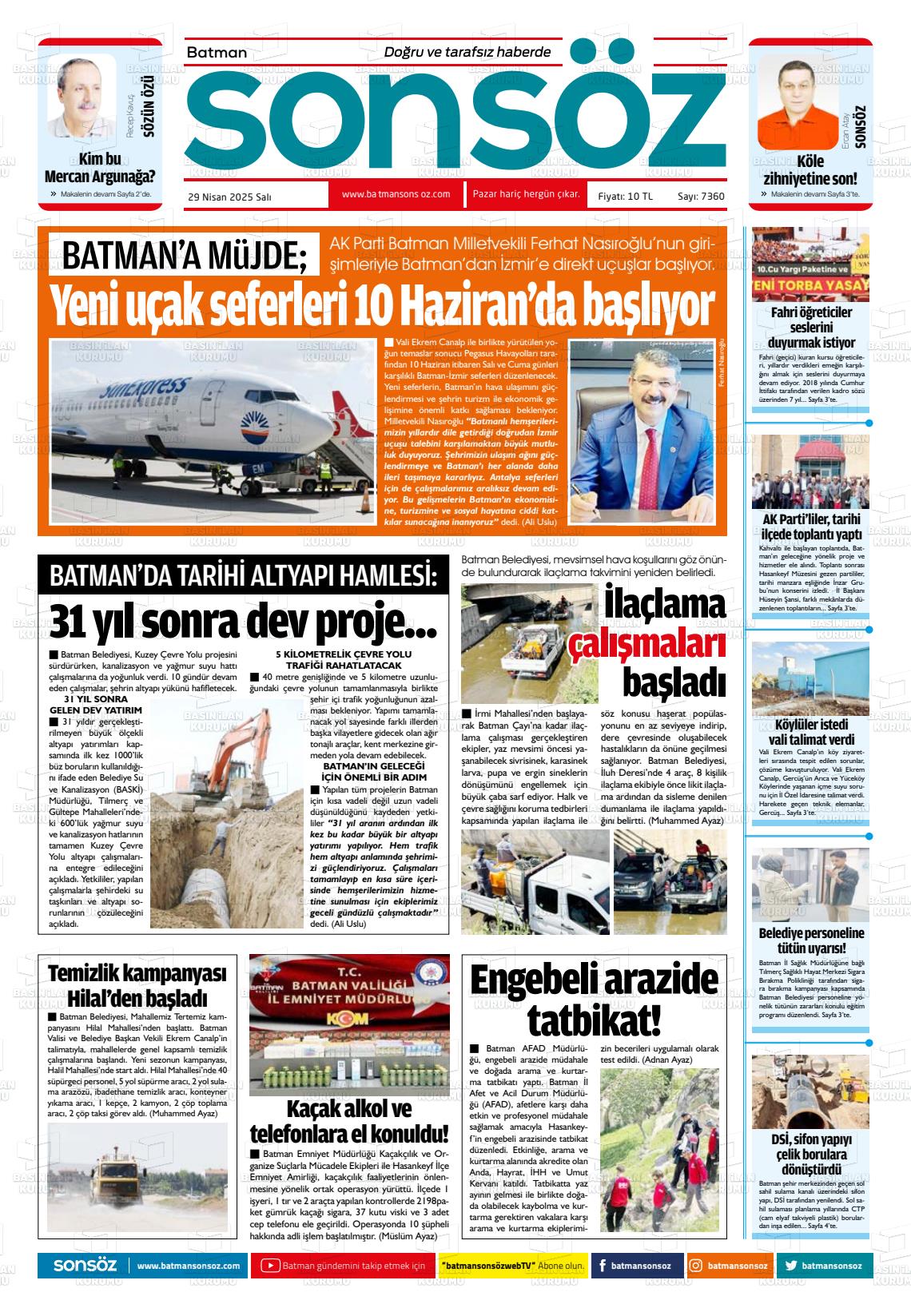 Batman Sonsöz Gazetesi’nin 29 Nisan tarihli manşeti