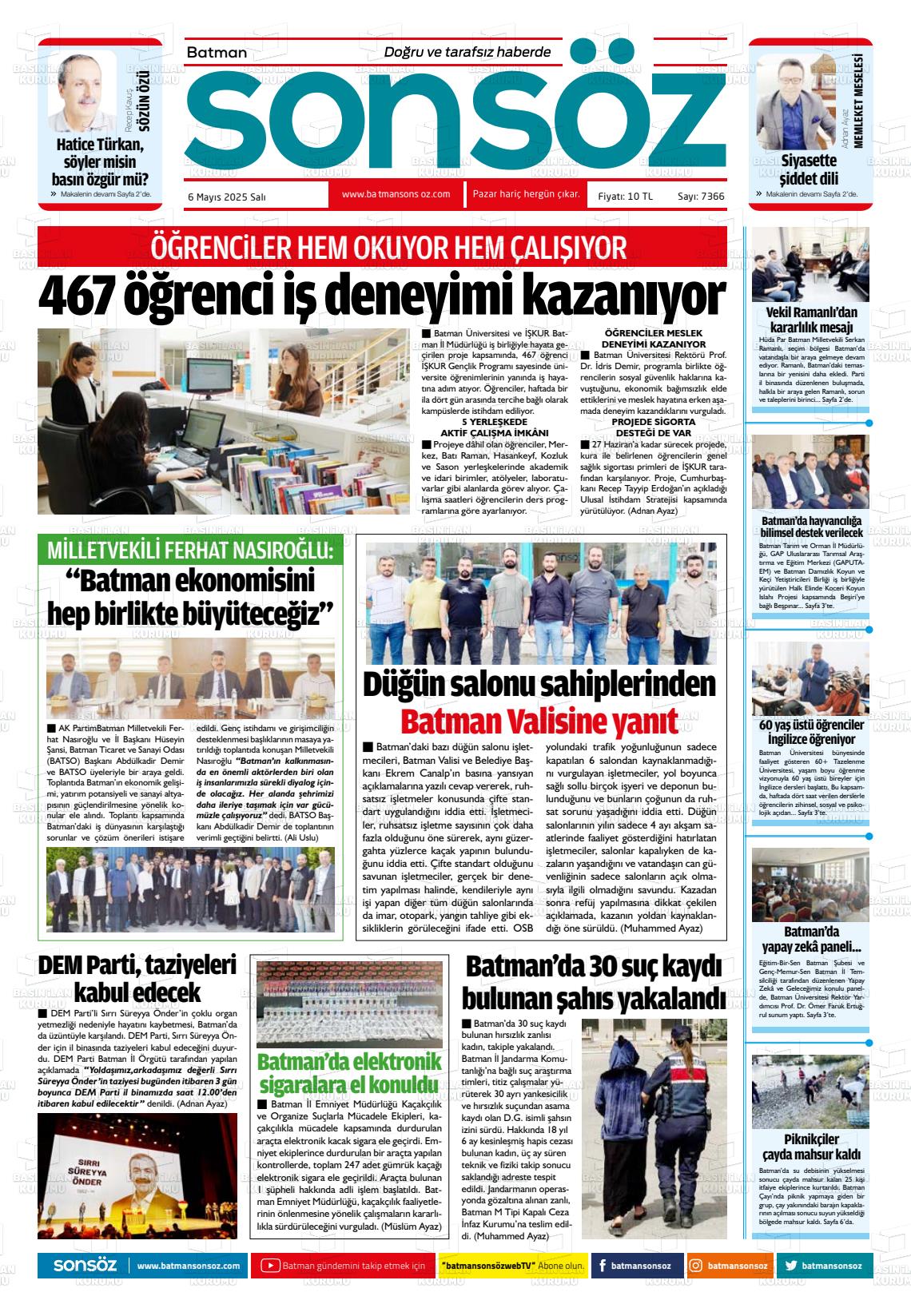 Batman Sonsöz Gazetesi’nin 6 Mayıs tarihli manşeti