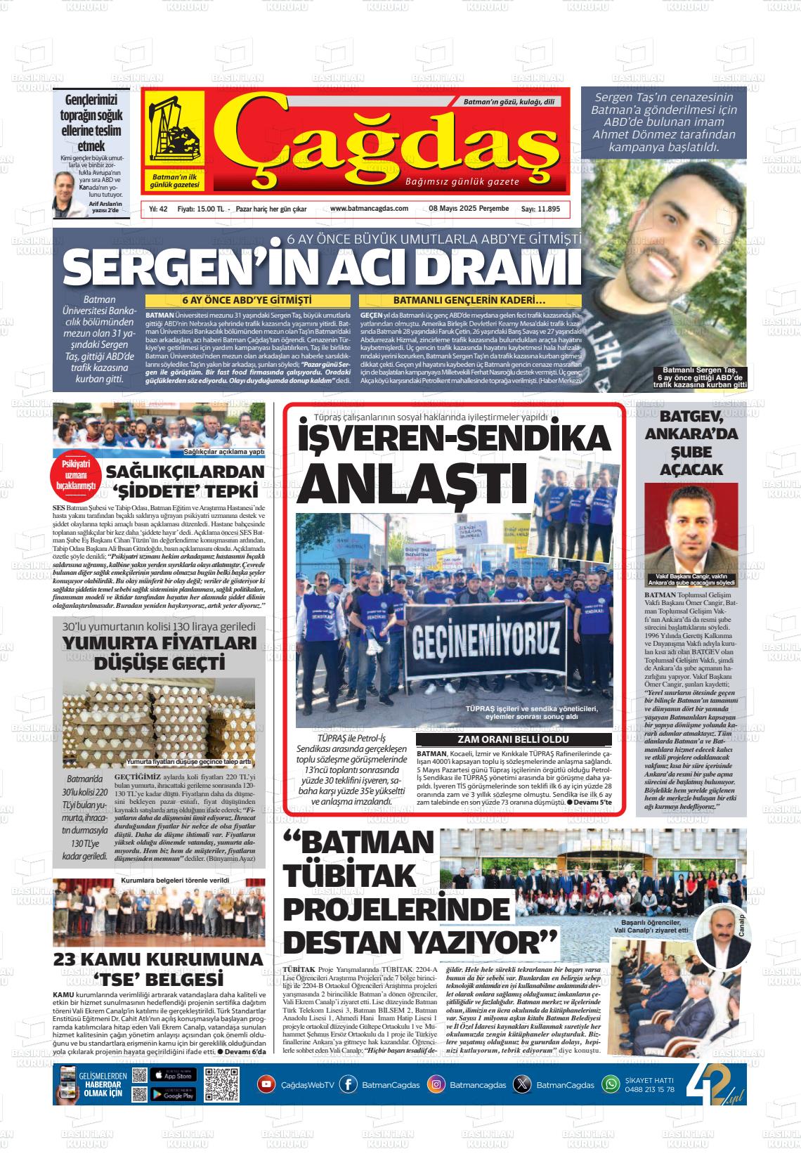 Batman Çağdaş Gazetesi’nin 8 Mayıs tarihli manşeti