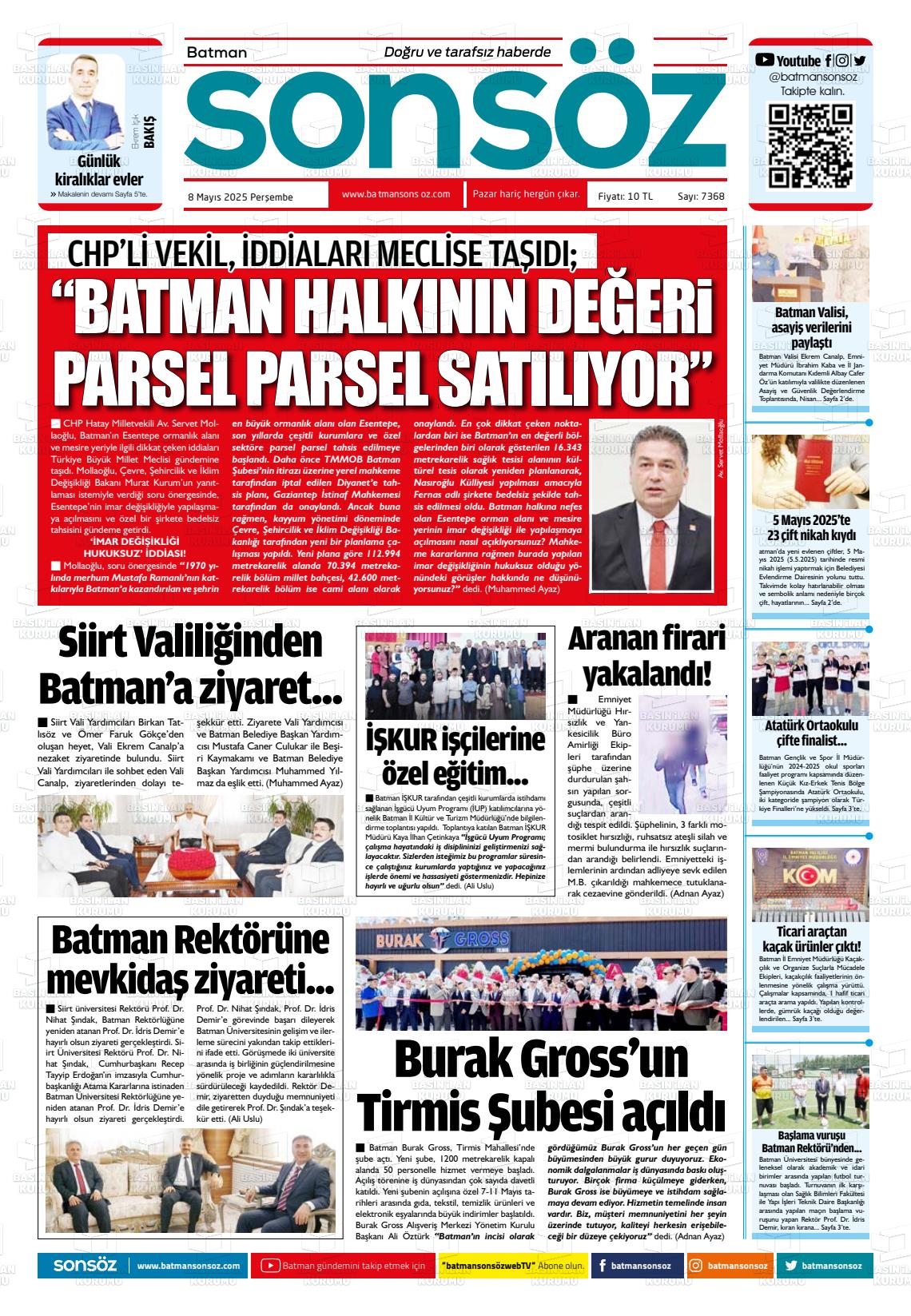 Batman Sonsöz Gazetesi’nin 8 Mayıs tarihli manşeti