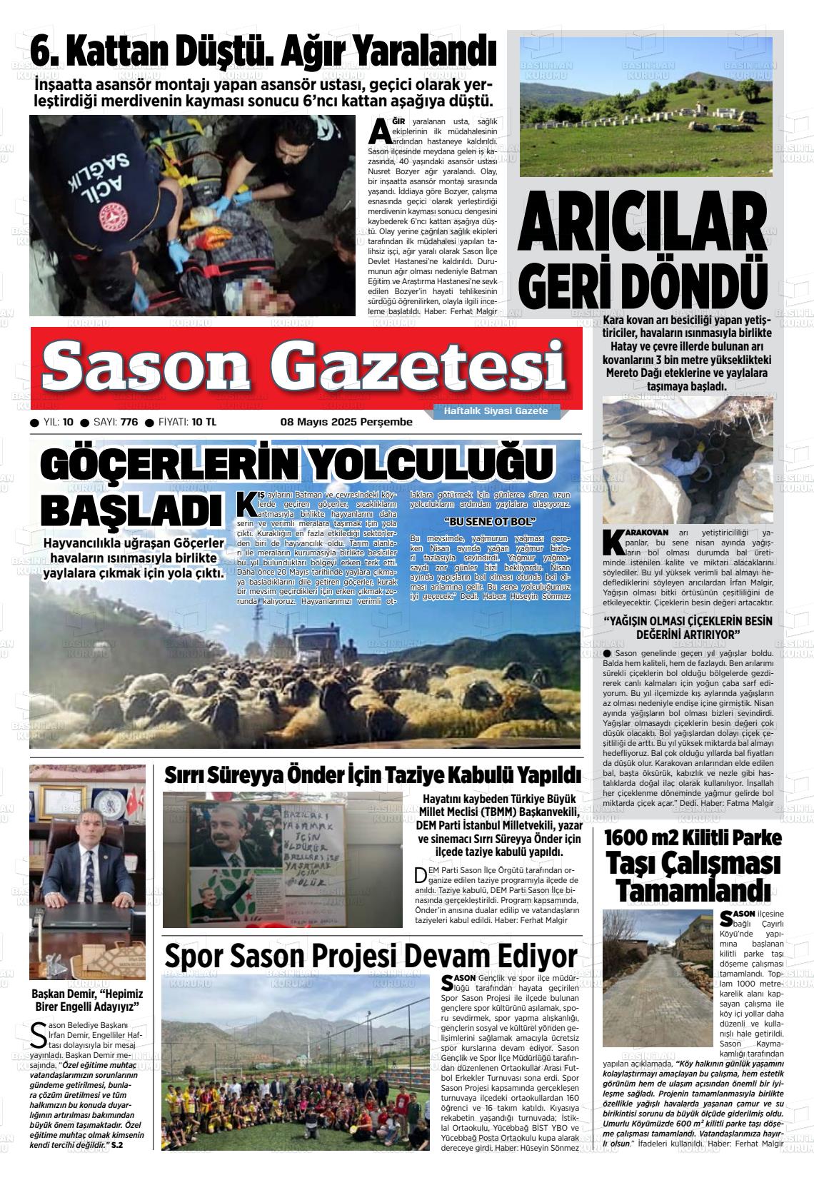 Sason Gazetesi’nin 8 Mayıs tarihli manşeti